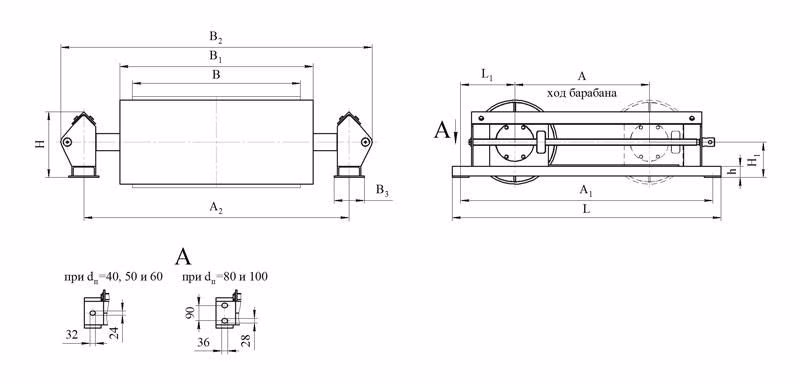 Пример условного обозначения устройства натяжного винтового для конвейера шириной ленты В=1000 мм, с барабаном 400 мм, внутренним диаметром подшипника 60, ход натяжки 500 мм: